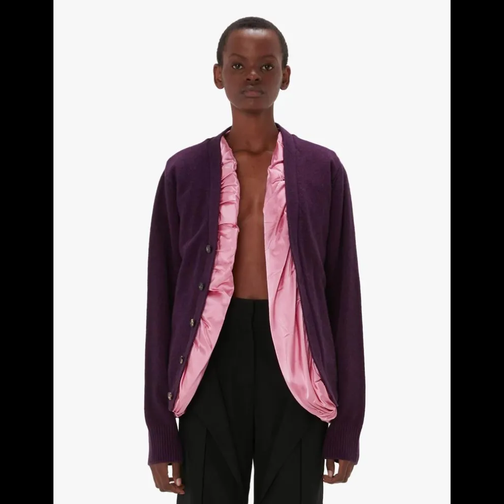 Cardigan frontal de malha fina com botões e forro de cetim contrastante Ajuste clássico Bainha e punho canelados Inserção de cetim franzido em contraste Detalhe da marca em bordado de âncora com assinatura tonal Ajuste descontraído