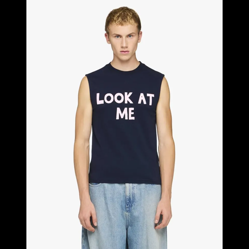 LOOK AT ME PRINTED TANK TOP. tshirt em jersey sem mangas com estampado “Look at me” Decote redondo Bainha de corte reto Ajuste descontraído, use o seu tamanho habitual