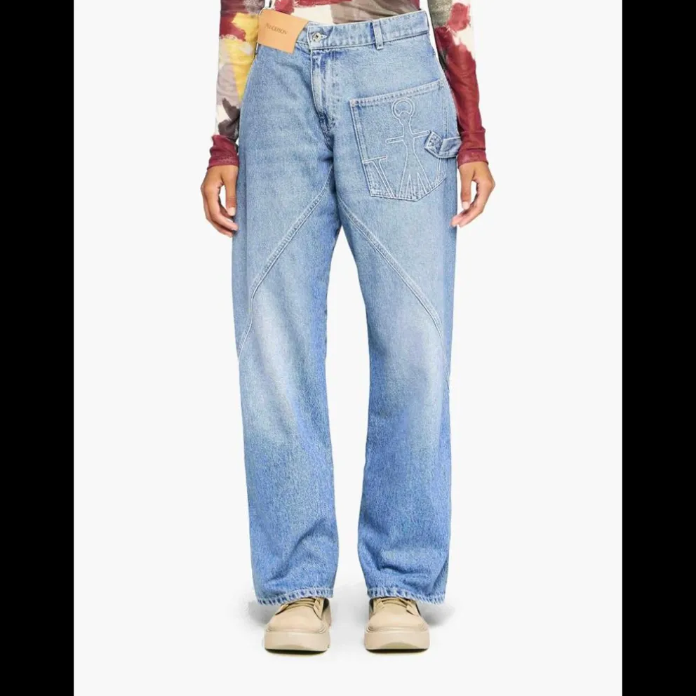 Jeans com corte descontraído Silhueta torcida Costuras curvas Cintura baixa Laço de carpinteiro Bolso frontal com ponto de perfil de âncora Patch em pele noz-pecã com logotipo em relevo Pesponto de tabaco contrastante Ferragens em tom prateado.