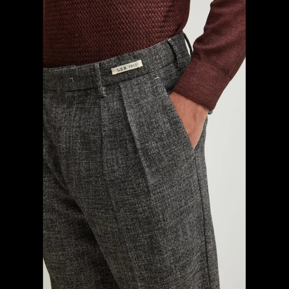 Calças confeccionadas com uma fina mistura de lã e algodão mouliné duplo trançado, delicadamente tingida em cuba holandesa, caracterizada por um micro padrão retro.