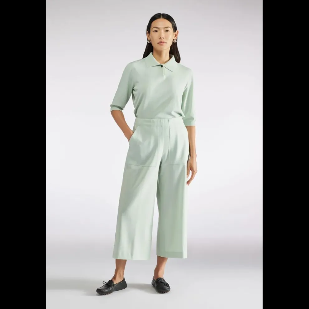 Calça curta de gabardine de lã, boca de sino, cós com elástico nas costas, fecho de correr lateral, bolsos frontais em chapa com abertura lateral.