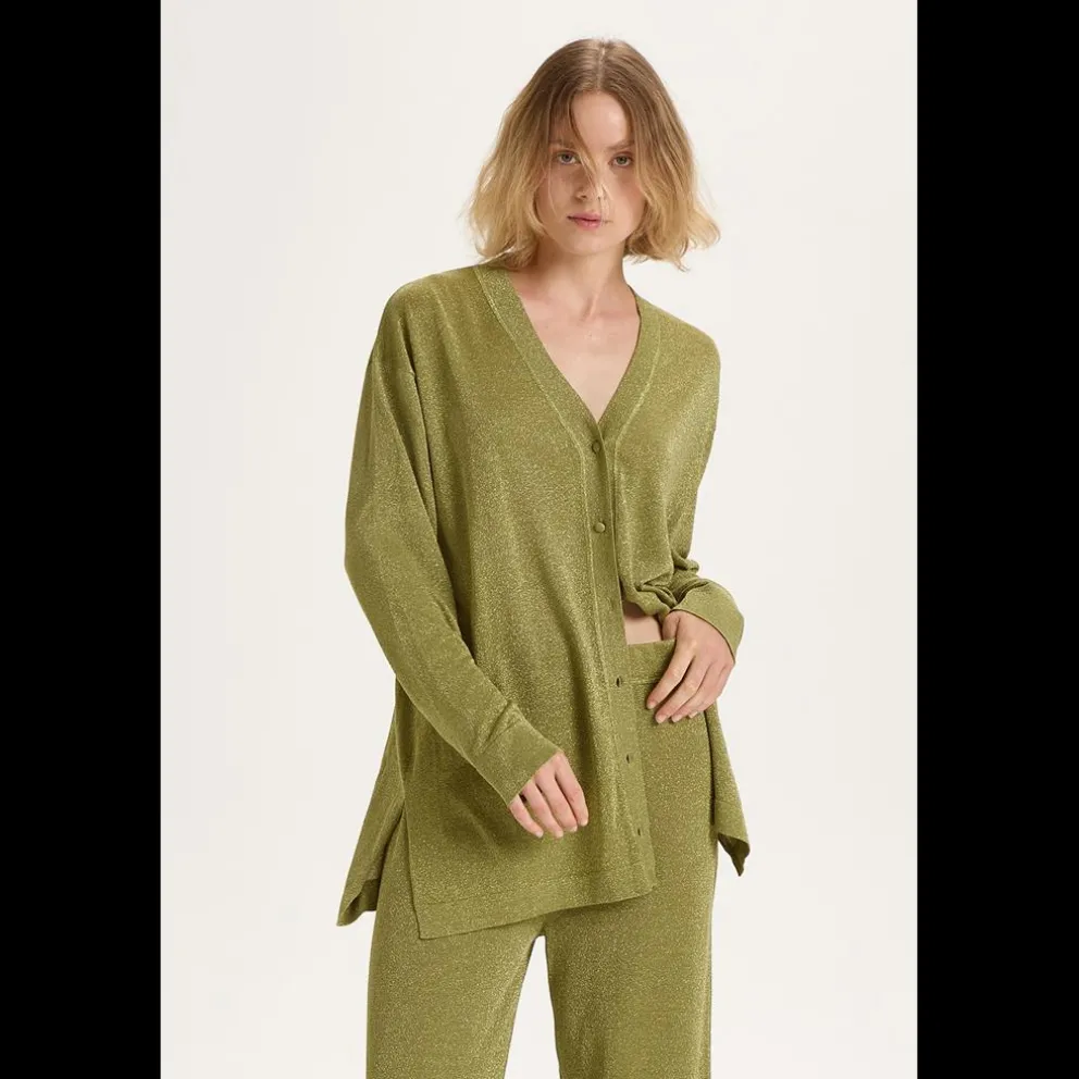 Cardigan largo com decote em V, leve e quente, jersey simples vanisé, lurex leve e quente à mão, fio de mistura de viscose metalizada, botões forrados em tricô, calibre 14.