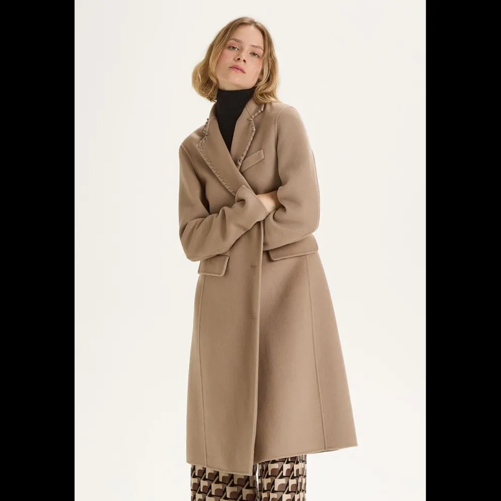 Casaco direito mas feminino com patch de botão de inspiração masculina, totalmente costurado à mão. Fio em pele sintética na cor correspondente para gola e lapelas.