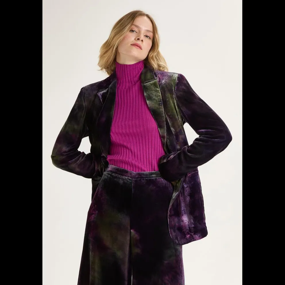 Casaco de senhora de corte único, em veludo mescla de viscose, tie&dye tingido à mão, com lapelas, bolsos de debrum e botões forrados a tecido. No interior o forro apresenta manchas de cores contrastantes.