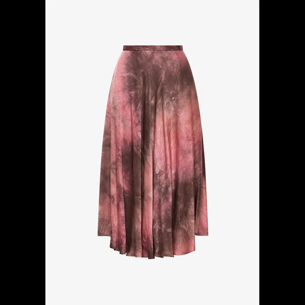 Como um pôr do sol a pôr-se, a saia em corte A da Precious Shadow com estampado tie-dye combina o rosa antigo e o castanho casca de árvore. Uma peça feminina em cetim tingido à mão, com um caimento etéreo, balançando graciosamente a cada passo.
