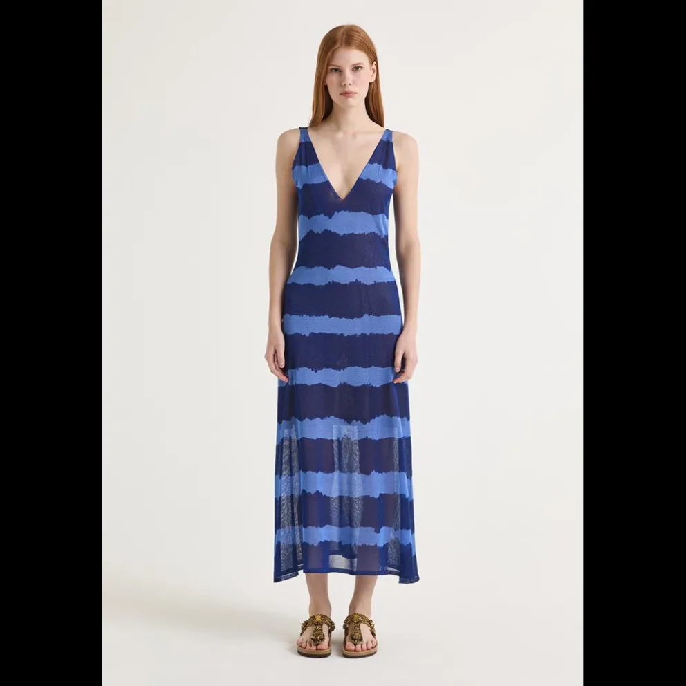 Um vestido tipo slip em fio de lurex de viscose ultraleve, com textura de malha jersey e estampado às riscas com efeito tie-dye. A bainha larga acrescenta leveza a cada passo. Finezza 14.