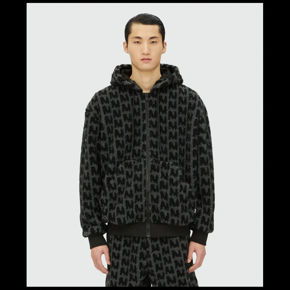 “TheMwave”, a nova linha de assinatura MSGM distinta introduzida por Massimo Giorgetti, símbolo de criatividade, inovação e liberdade de expressão. Jaqueta de pele sintética com padrão jacquard “TheMwave”. Capuz com cordão, fecho de zíper frontal,