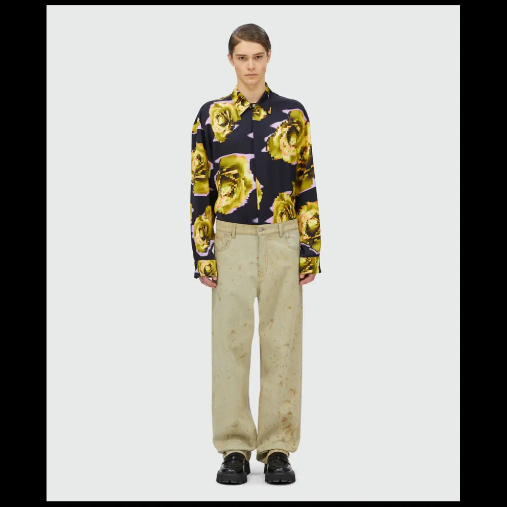 Calça jeans de algodão com efeito manchado obtido por tingimento manual com folhas de chá, tratamento que torna cada par único e irrepetível. Passantes para cinto na cintura e fecho frontal com zíper e botão. Modelo com cinco bolsos. Corte regular.