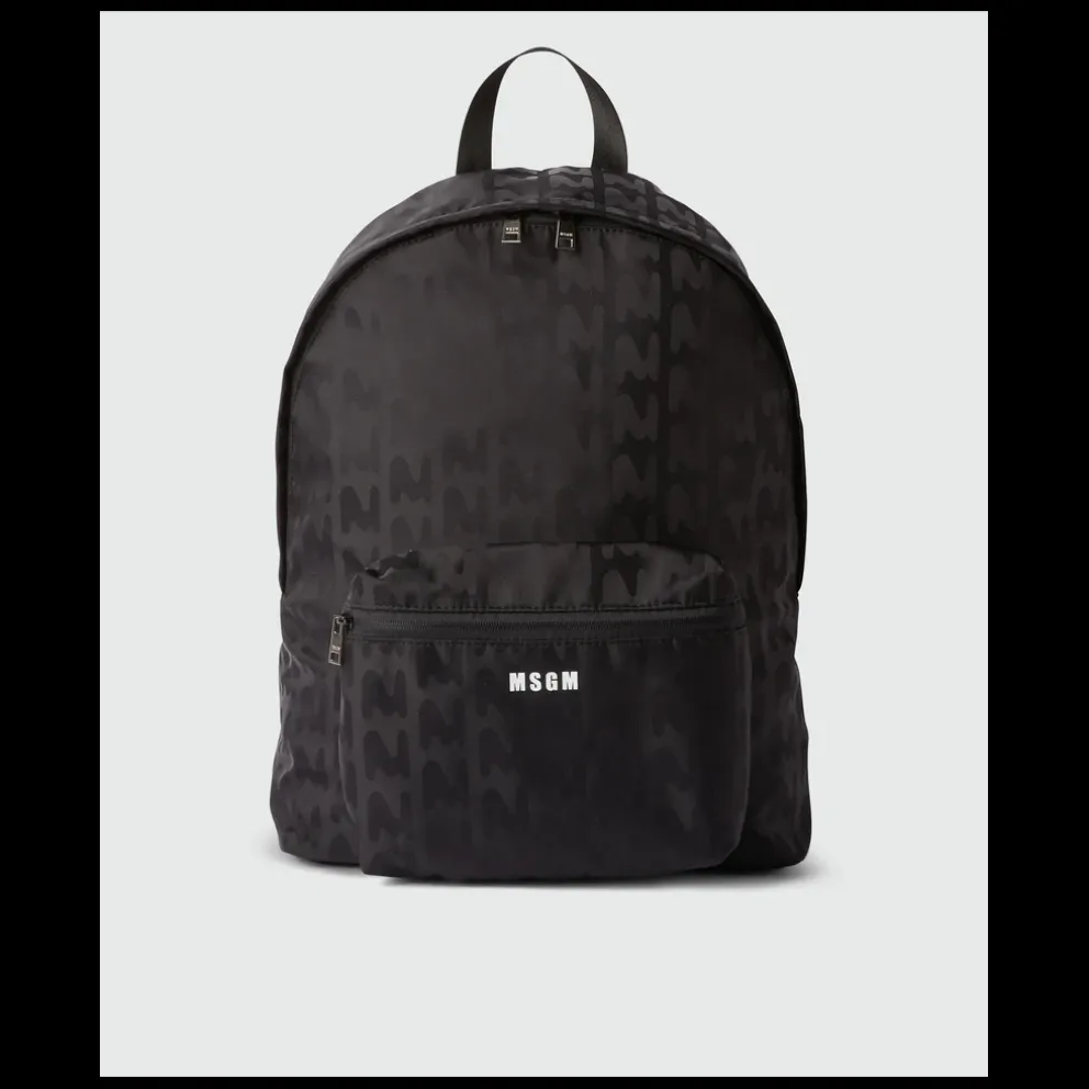 Mochila em nylon com logótipo jacquard em relevo. Pega superior. Fecho de correr duplo. Um bolso na frente e outro no interior. Alças acolchoadas ajustáveis. Forro de cor correspondente. Medidas: 46 x 36 x 21 cm