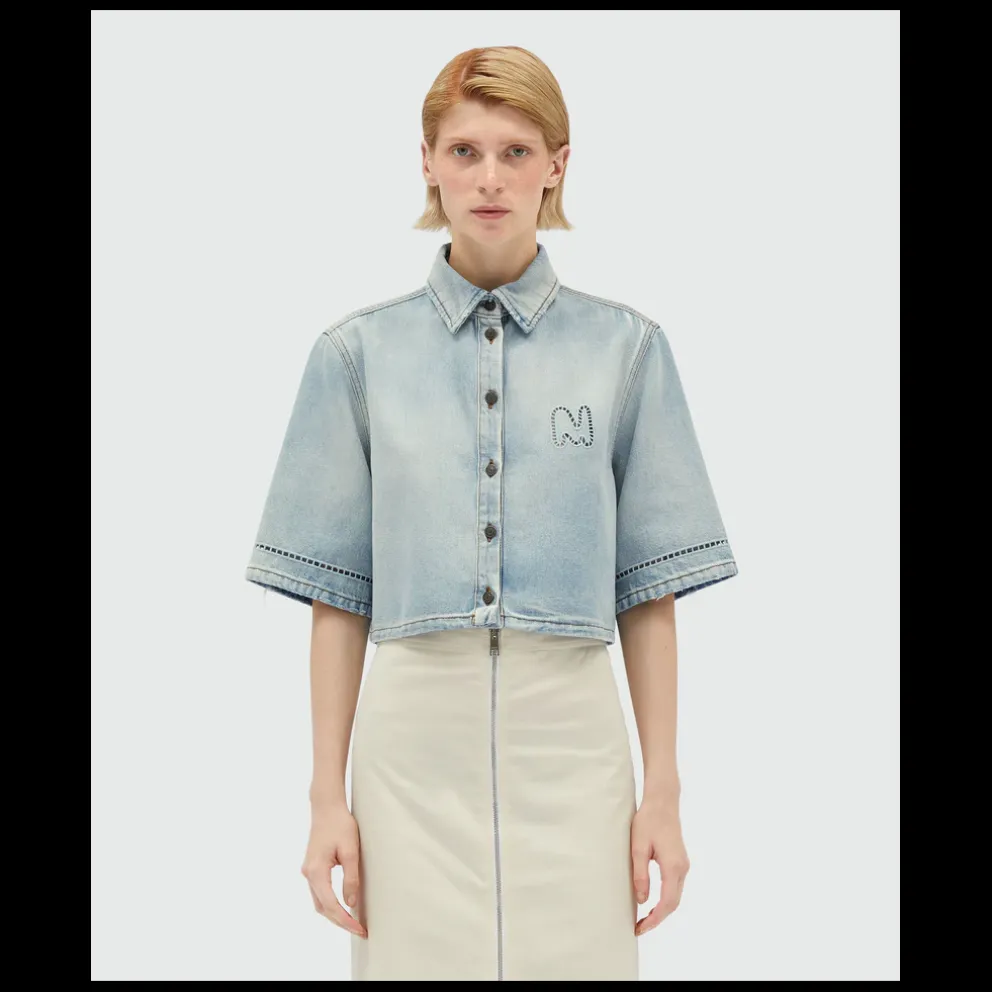 Camisola de ganga em algodão desbotado com detalhes perfurados na parte inferior das mangas e logótipo Mwave no peito. Gola clássica e fecho frontal com botões em metal. Mangas curtas largas. Corte curto
