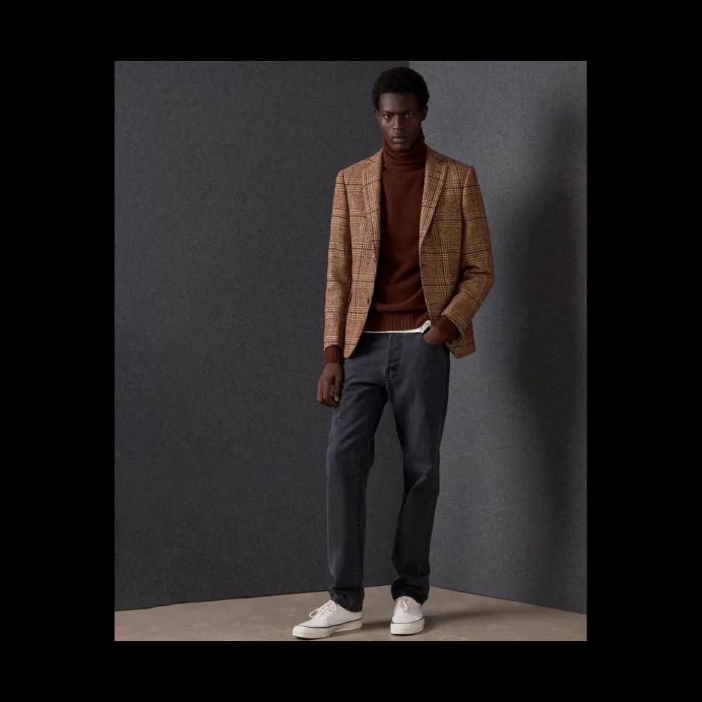 Blazer de dois botões de abotoamento simples, ombro macio. Bolsos com aba, aberturas duplas na parte de trás. Totalmente forrado. Lã virgem italiana.