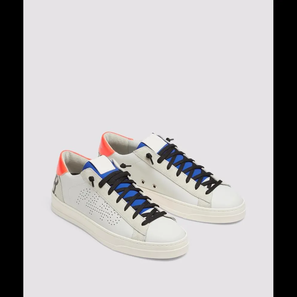 O Jack Flash é revestido em pele branca e camurça bege claro, realçada por pele azul fluorescente e laranja. Atacadores de algodão preto e solas amarelo fluorescente completam o look.