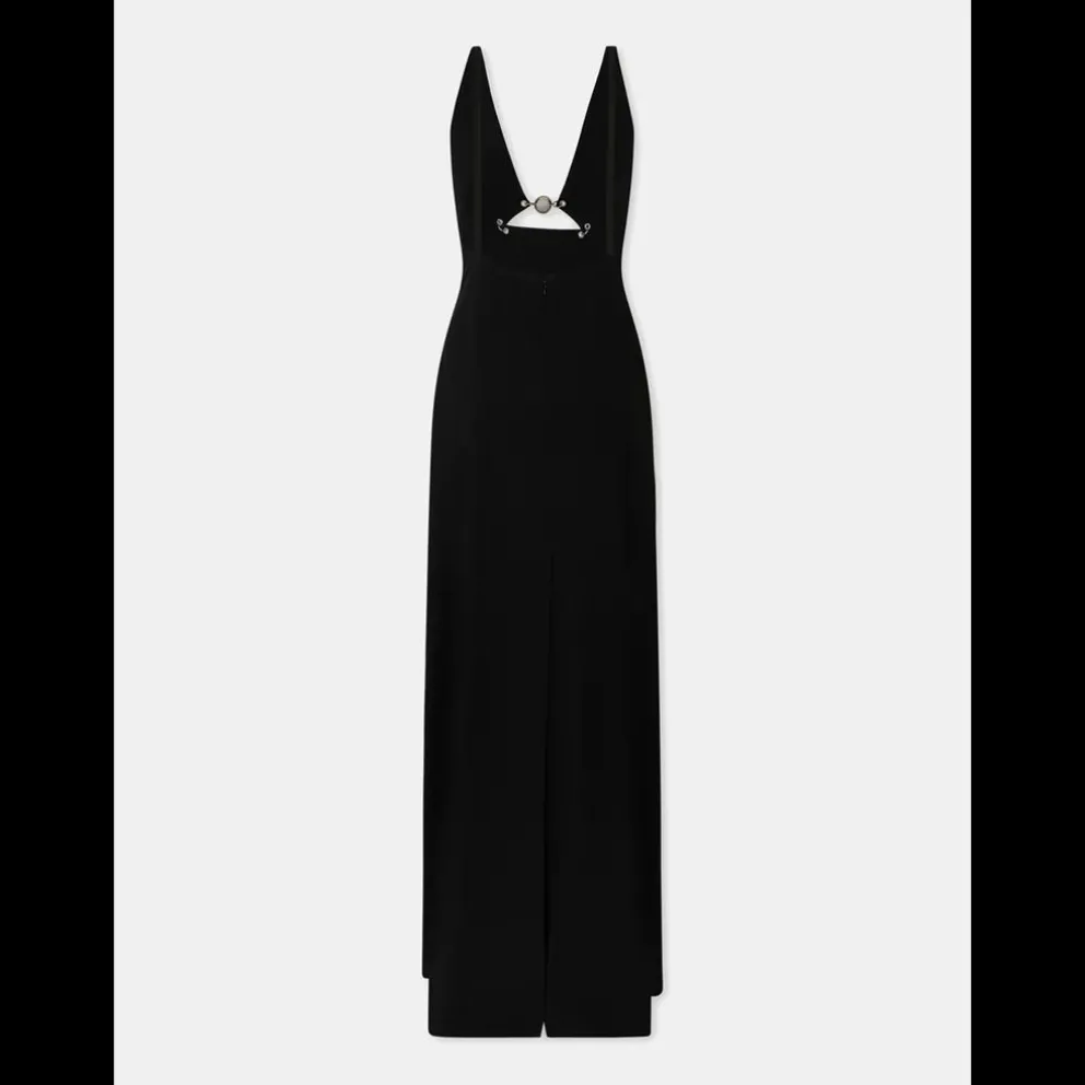 Vestido maxi inspirado no desfile Outono-Inverno 23 adornado com detalhe de pérolas no decote contrastando com a cor escura do vestido. O formato simétrico deste vestido sem mangas mostra o savoir-faire arquitetónico da Maison