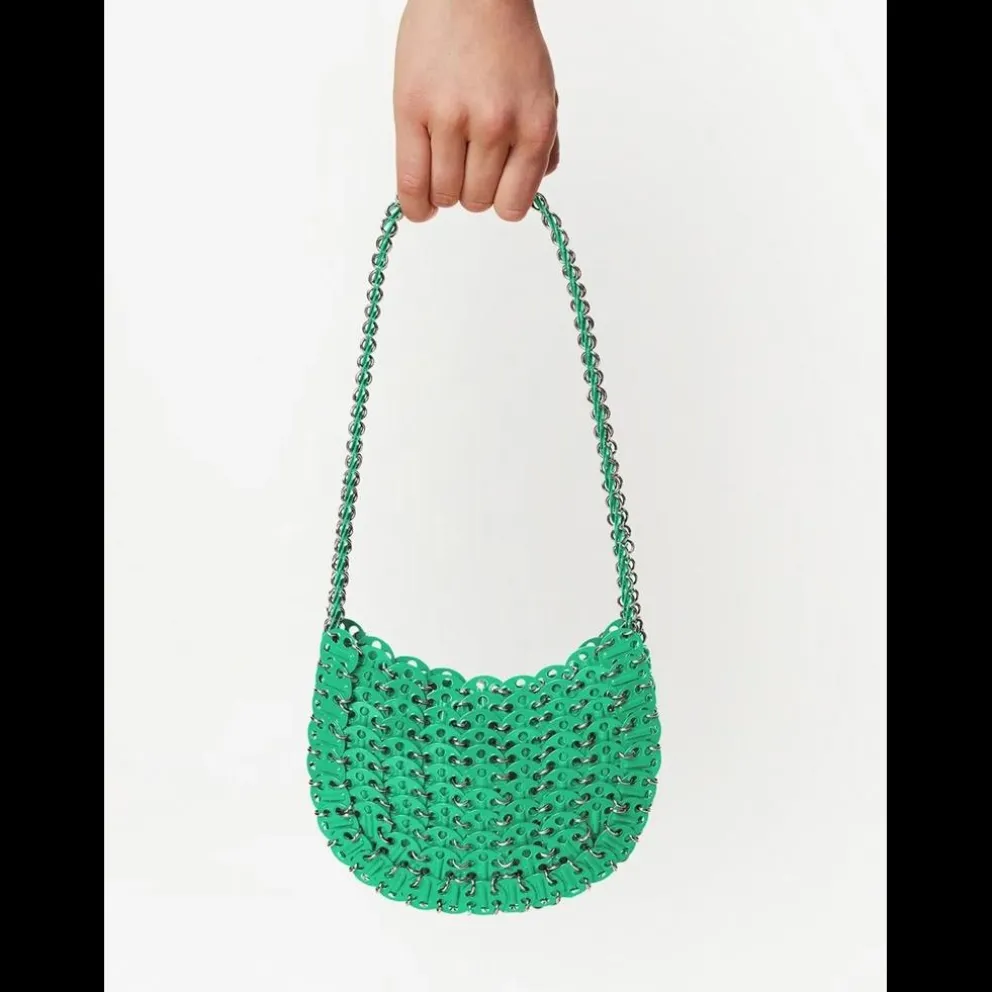 Bolsa de ombro Moon 1969 Paco Rabanne é conhecido pelo uso de materiais invulgares. Esta bolsa é composta por discos de metal verde esmeralda, canalizando a abordagem experimental da marca.