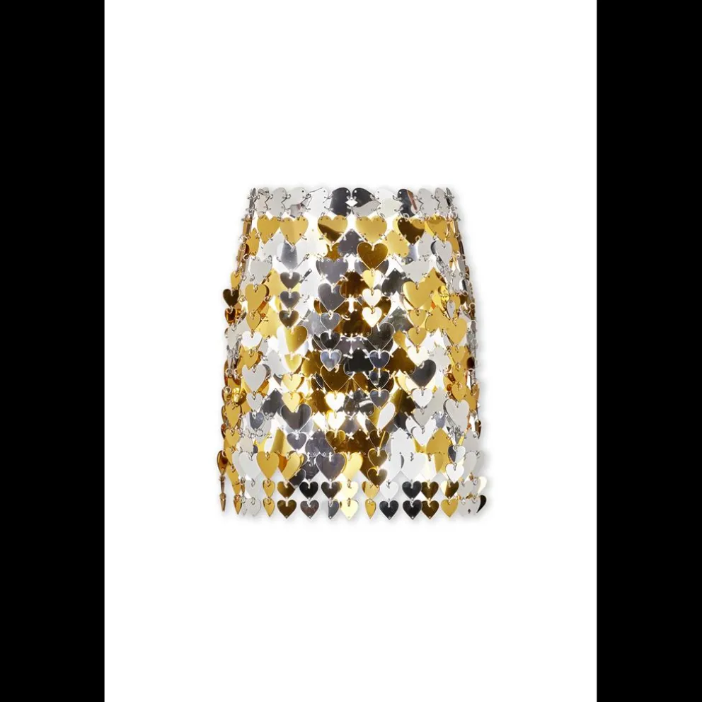 Saia fabricada numa subtil combinação de peças metálicas, em puro estilo Paco Rabanne. – Peças em forma de coração – Dourada e prateada – Corte ajustado – Molas nas costas – Composição: 60% plástico, 40% cobre – Cuidados: limpeza profissional