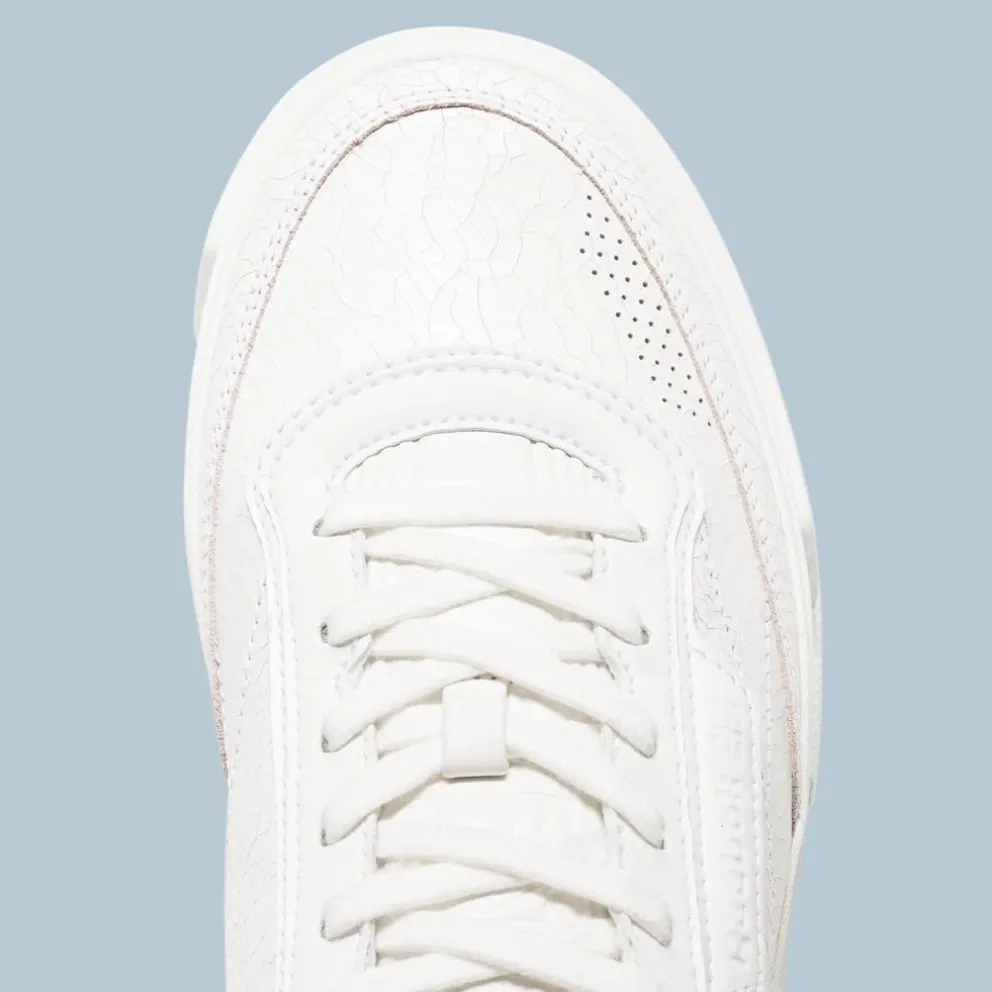 O Club C LTD é uma versão contemporânea do tênis vintage inspirado no tênis de 1985. Esta versão toda branca tem uma parte superior em couro rachado, enquanto a sola se estende na frente com um pára-choque estriado distinto.
