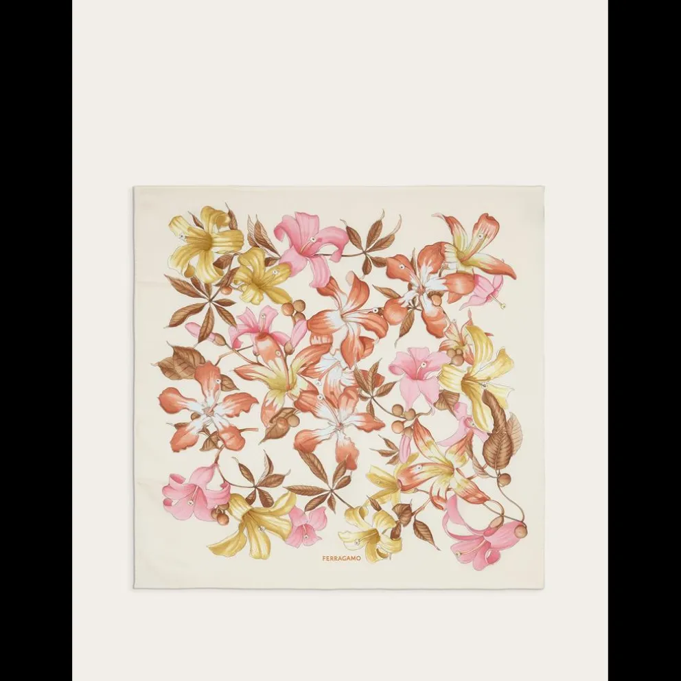 Lenço de seda pura adornado com estampa de inspiração floral com corolas de hibisco multicoloridas em tons pastéis e mais ousados. O tratamento estético contemporâneo em uma estampa inspirada em padrões clássicos torna esse acessório cool. 90x90cm