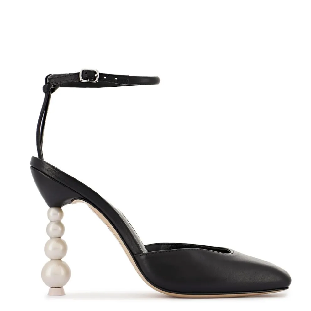 Apresentamos o nosso clássico sapato de couro preto com salto pérola, ‘Perla’. Concebido com uma silhueta sedutora de bico quadrado fechado e adornado com uma tira simples no tornozelo com elegantes detalhes prateados. Salto 10mm
