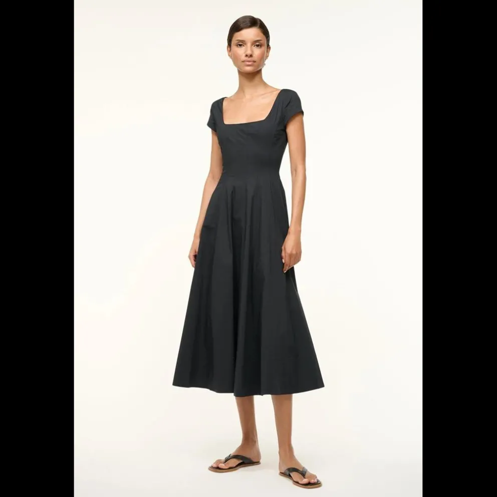 O nosso clássico vestido midi de popelina com manga curta. Este estilo é inspirado no vestido Wells exclusivo da STAUD e apresenta a mesma construção de painéis estilo espartilho e saia em corte A.