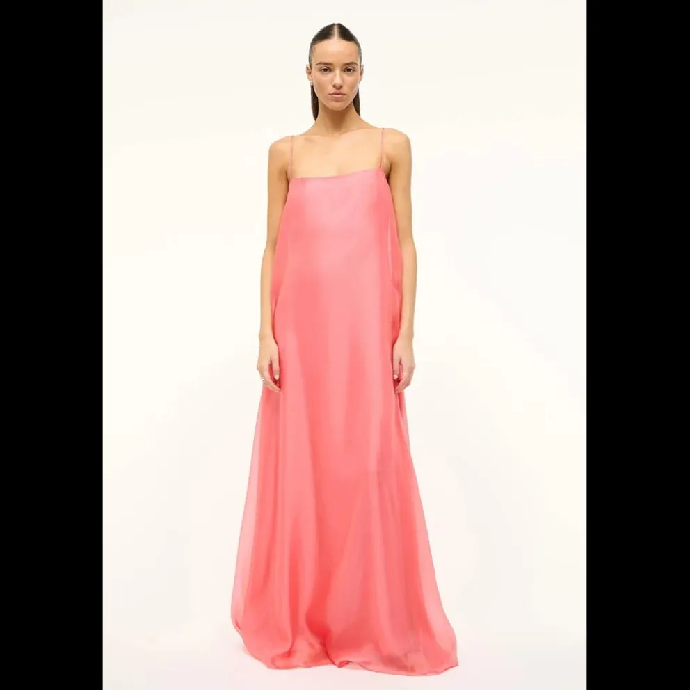 Um vestido maxi fluido que pode ser facilmente vestido para cima ou para baixo. O Maxi Delfina apresenta gola quadrada, alças finas e drapeado em linha em todo o corpo.