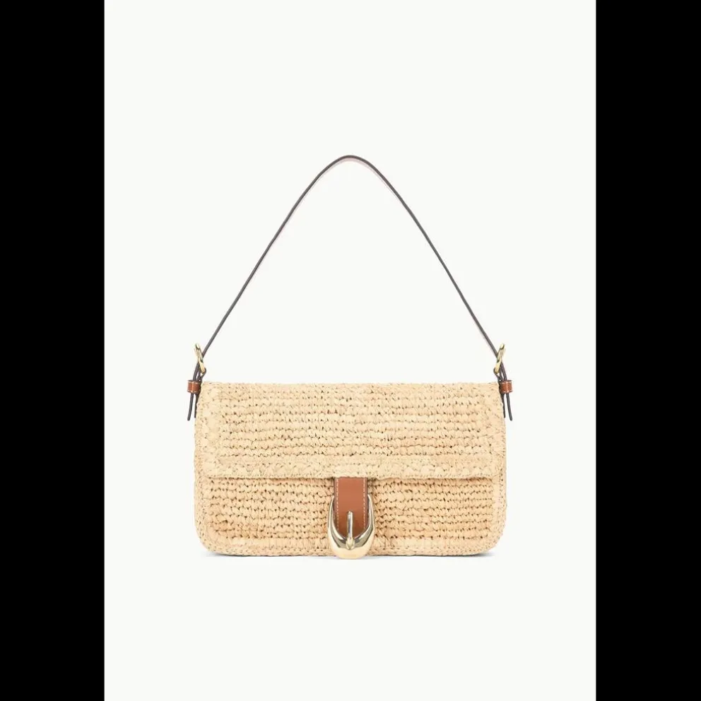 A bolsa Harlow em ráfia apresenta a nossa fivela exclusiva Moon, fecho de mola e um bolso interior.