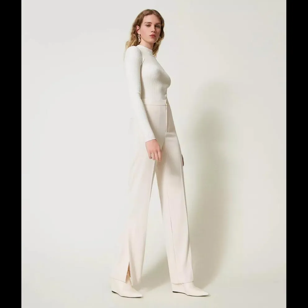 Calça confecionada em tecido crepe stretch com toque firme, fecho e botão na mesma cor, bolsos oblíquos, placa com logótipo T oval nas costas, vinco permanente, corte direito.