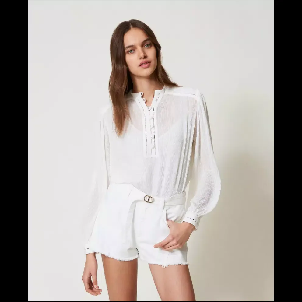 Calções confecionados em ganga de algodão elástico com cinto a condizer com fivela oval T de metal. Cintura regular, presilhas para cinto, fecho de correr e botão com o logótipo, costura inclinada na frente, cinco bolsos, bainha desfiada, corte solto