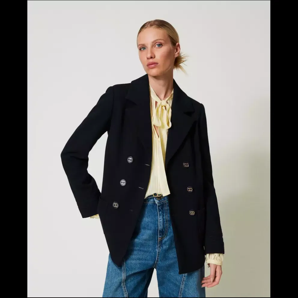 Casaco Caban confecionado em tecido macio, entrançado à mão, com estrutura em crepe. Gola lapelas, abotoamento duplo com botões dourados com o logotipo Oval T em relevo, mangas compridas com ombreiras e bordado em ponto à jour tonal, bolsos