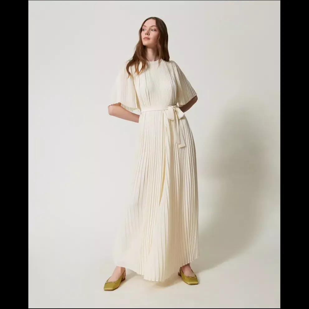 Macacão comprido plissado em crepe georgette com cinto removível a condizer, feito em tecido liso. Gola redonda, botões em metal com logótipo Oval T em relevo nos ombros, manga curta com pregas planas, costura na cintura, calças largas em semicírculo