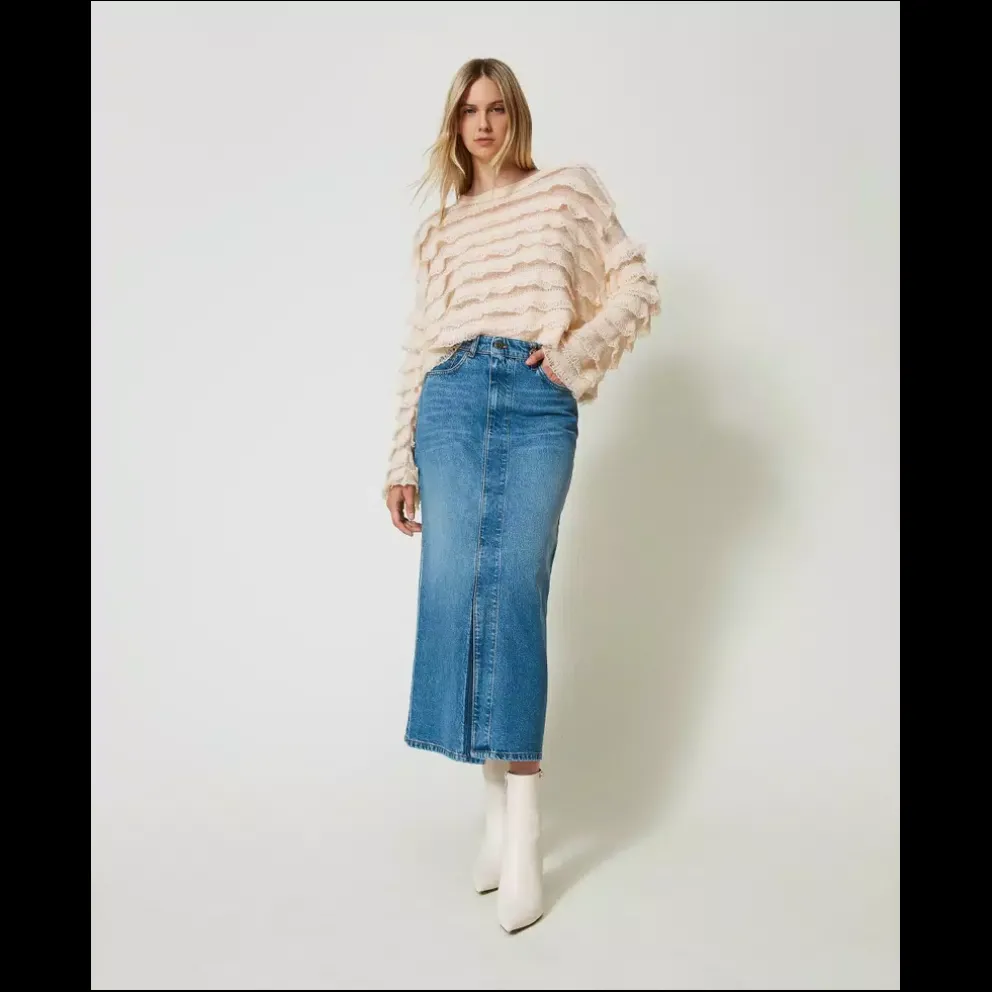 Saia midi confecionada em Itália em ganga de algodão índigo. Cintura alta, fecho de correr e botão com logótipo, cinco bolsos, fecho metálico com logótipo em T oval, racha central na frente, lavagem pedra clara com descolorações claras localizadas,