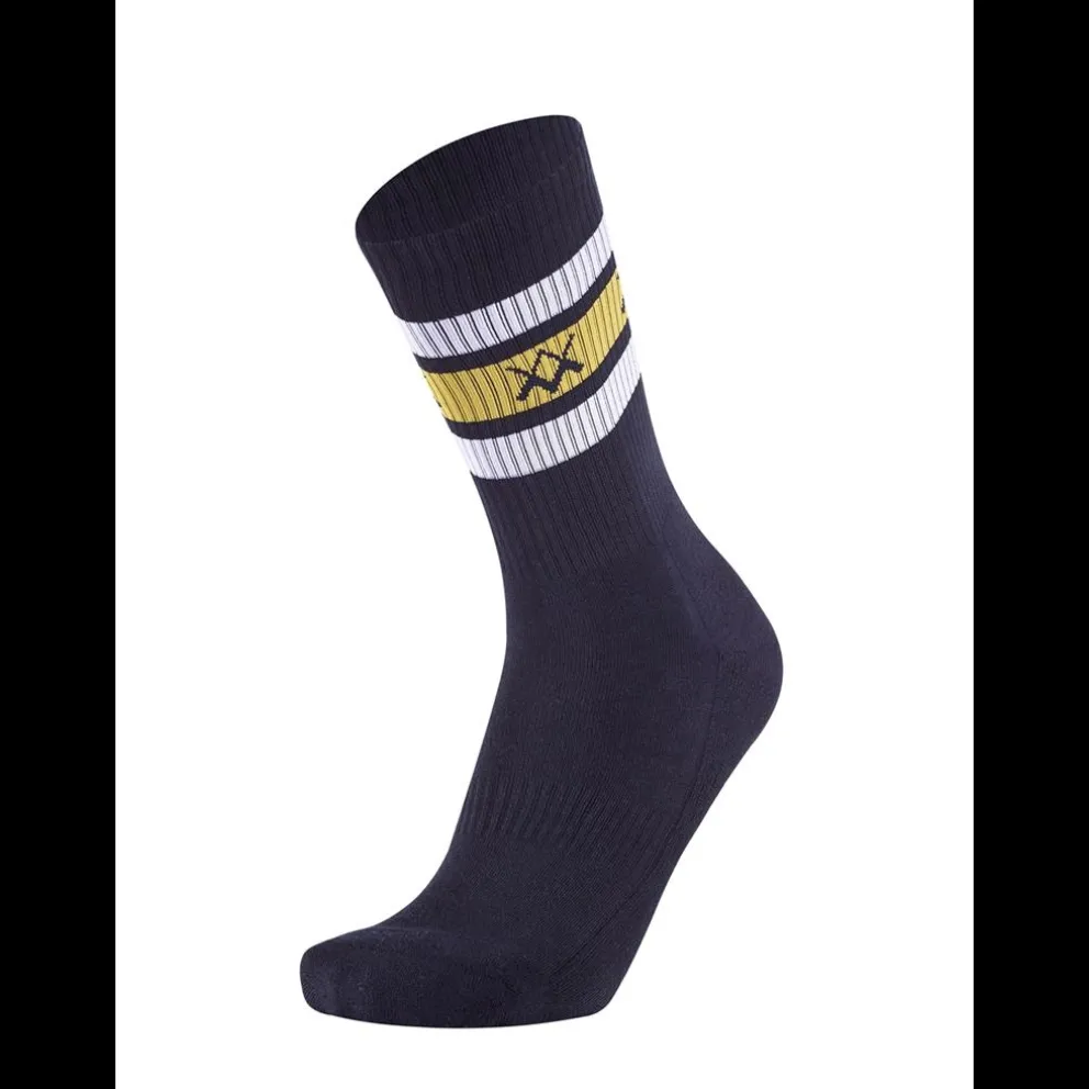 Meias modernas em ribe, com elevado nível de conforto graças ao algodão macio e suave para a pele. – Design desportivo com riscas Old School e logotipo WestMister tricotado – Sola suavemente acolchoada e ajuste anatómico WestMister