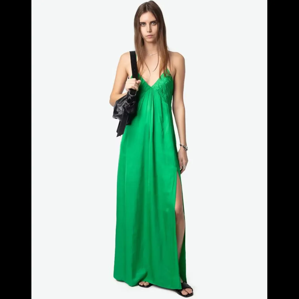 Satin Rayon Dress. Vestido comprido plissado inspirado na lingerie, em cetim, com racha e alças cruzadas ajustáveis.