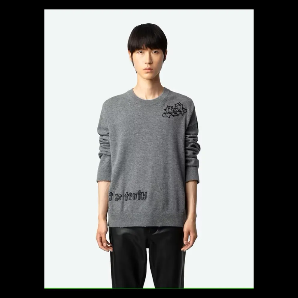 Camisola folgada de malha cinza médio de manga comprida com motivos bordados em jacquard intarsia e grafites.