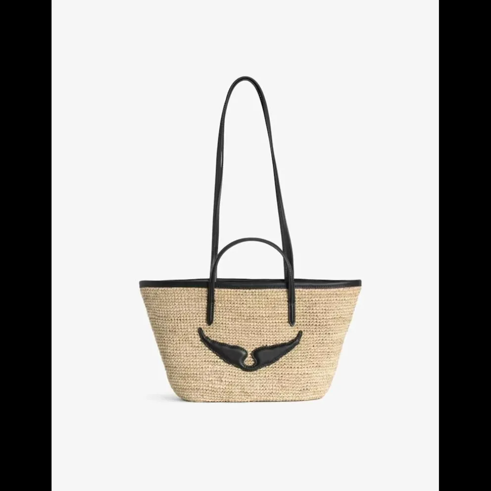 Pequena cesta em ráfia com pegas em couro, adornada com asas. 18 x 21 cm. Altura do cabo: 32 e 11 cm