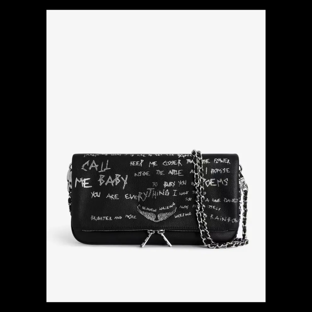 Rock Clutch. Clutch em pele granulada com estampado graffiti e corrente dupla em pele e metal, e asas adornadas com strass.. 27 x 13 cm. Altura da alça da corrente: 33 e 57 cm