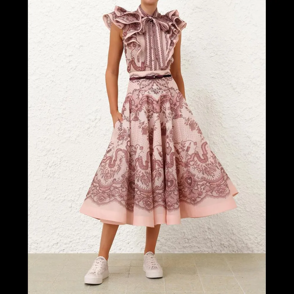 Saia midi de organza de linho de seda com bolsos laterais, fecho central invisível nas costas e cinto de veludo removível com detalhes em cristal e laço.