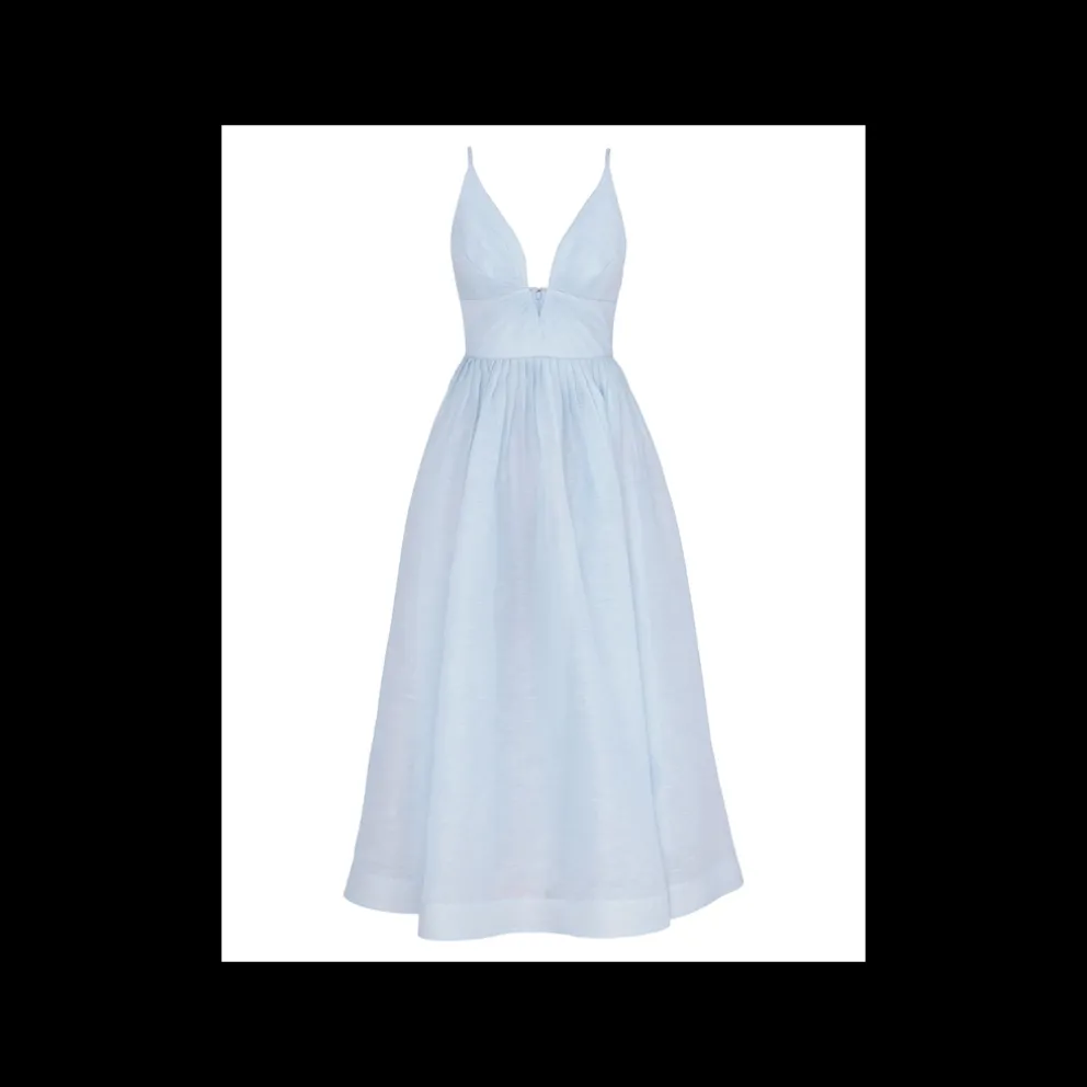 Vestido midi com decote em V Illuminate em cor menta da nossa coleção de primavera 2025, Illumination. Um vestido midi de linho e seda com corpete ajustado, decote em V profundo e saia franzida na cintura