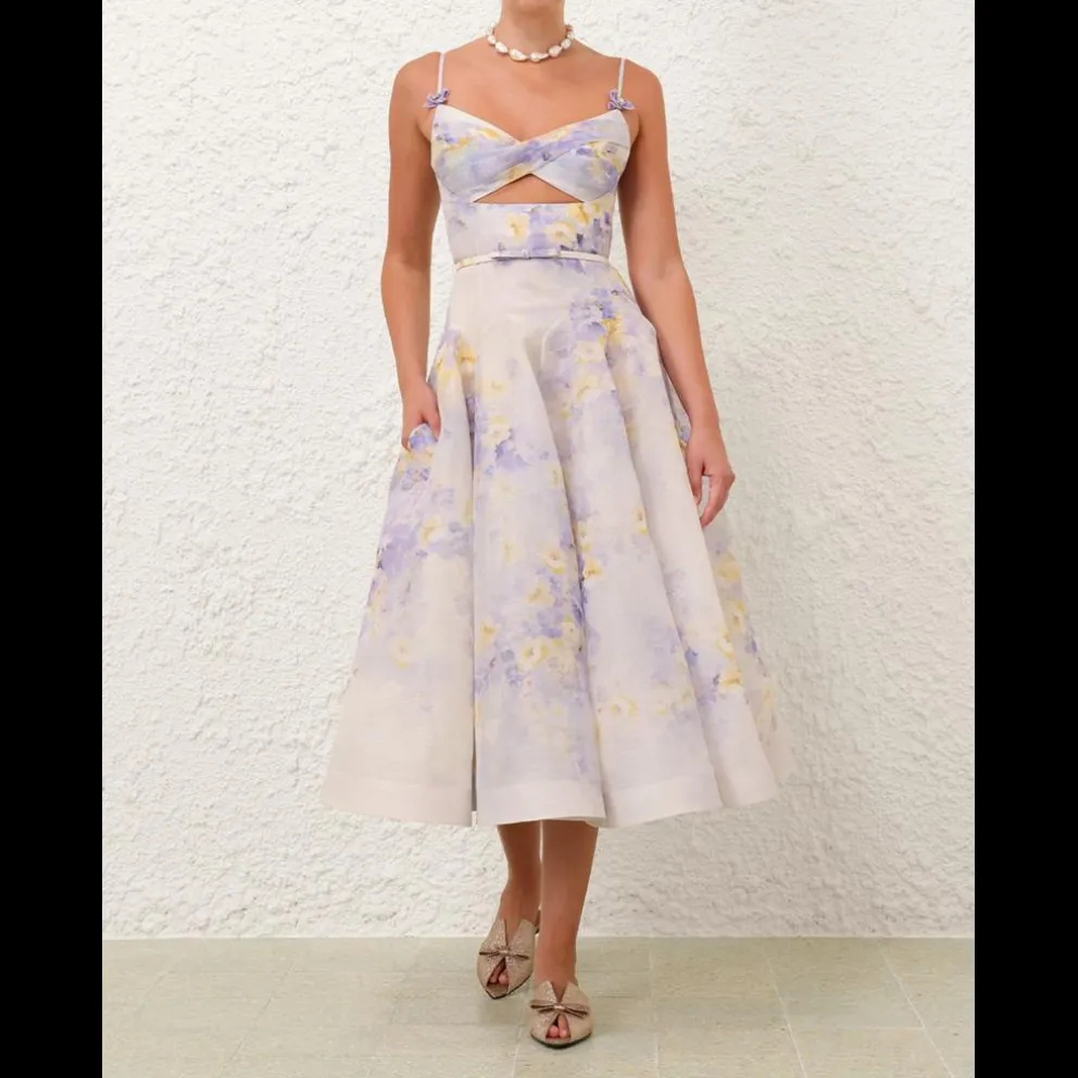 Vestido midi em linho e seda com prega cruzada no corpete, alças ajustáveis ??e rebordo na frente, nas laterais e nas costas.