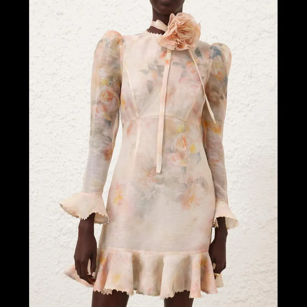 Minivestido em linho de seda com detalhes de folhos na bainha e nos punhos; finalizado com um pregadeira de flor com folhos destacável.