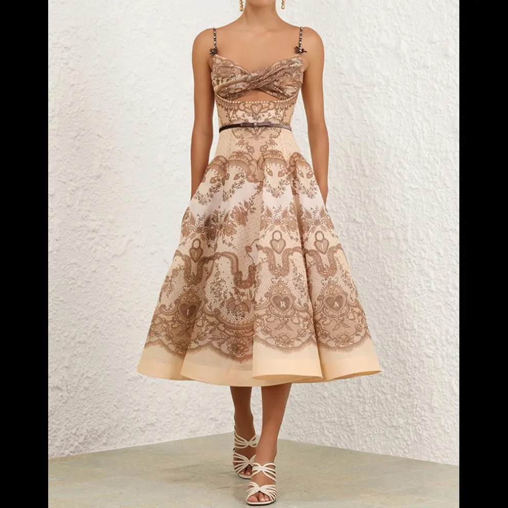 Crush Twist Front Midi Dress. Vestido midi de organza de linho e seda com detalhes torcidos no busto central e recorte por baixo, alças de veludo ajustáveis ??com cristais e detalhes de laço e bolsos laterais.