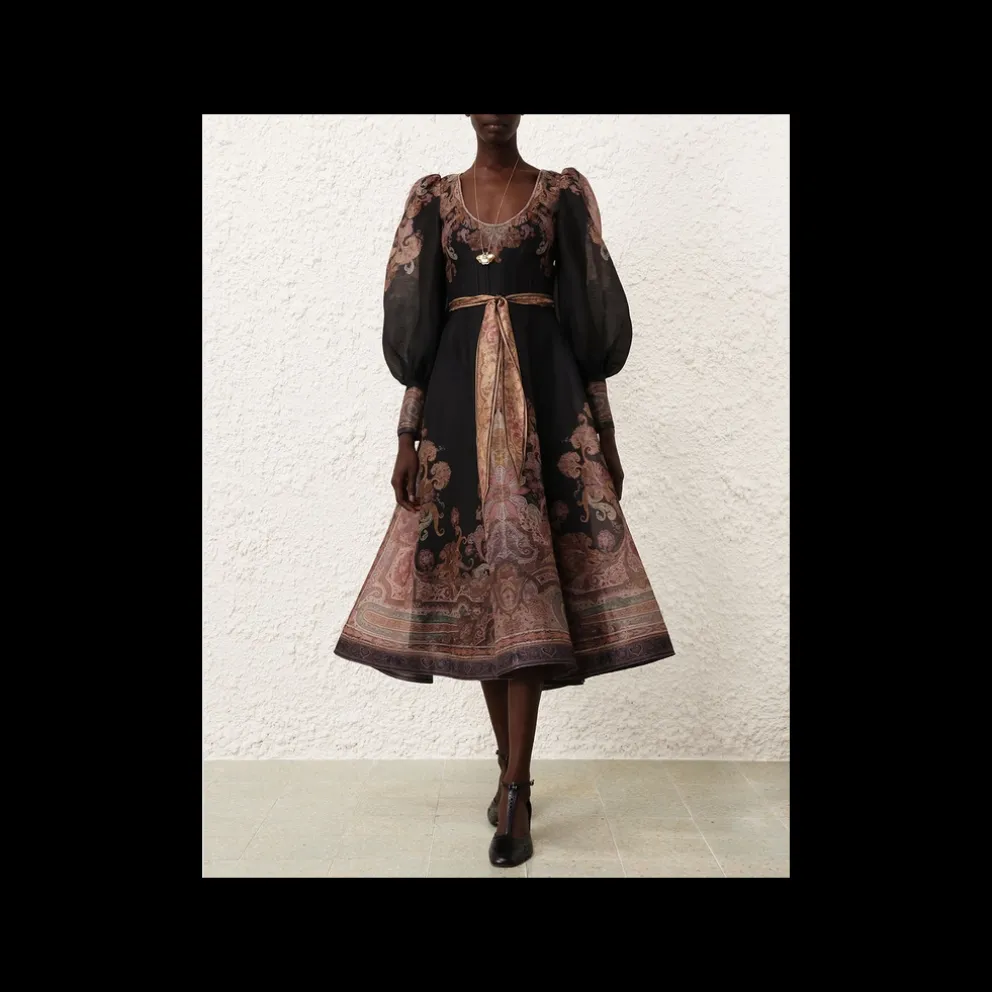 Vestido Estruturado Ilustração em Paisley Preto da nossa Coleção Outono 2024, em Ilustração. Vestido midi de organza de linho de seda com decote redondo, mangas compridas com punhos alongados com fecho e laço de seda removível na cintura.