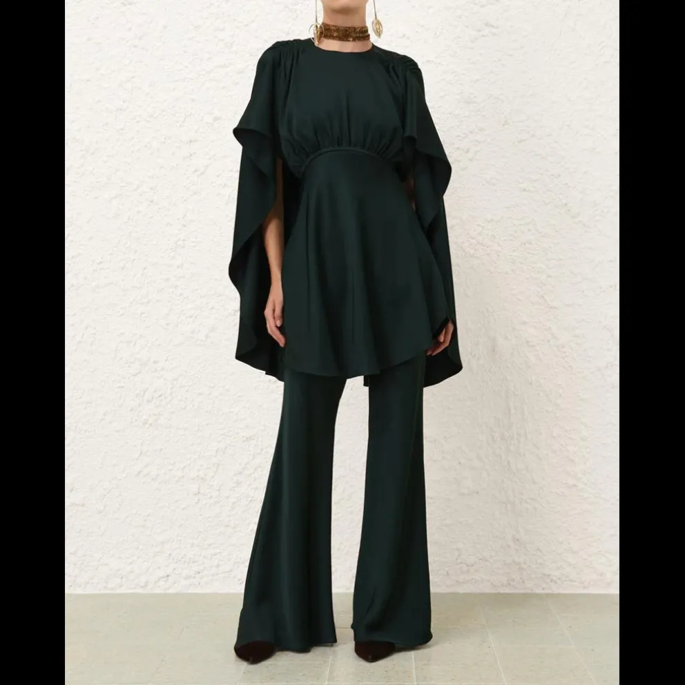 Calças Eden Slouch Flare em Bottle Green da nossa coleção outono 2024, em ilustração. Calça larga larga com cós elástico.