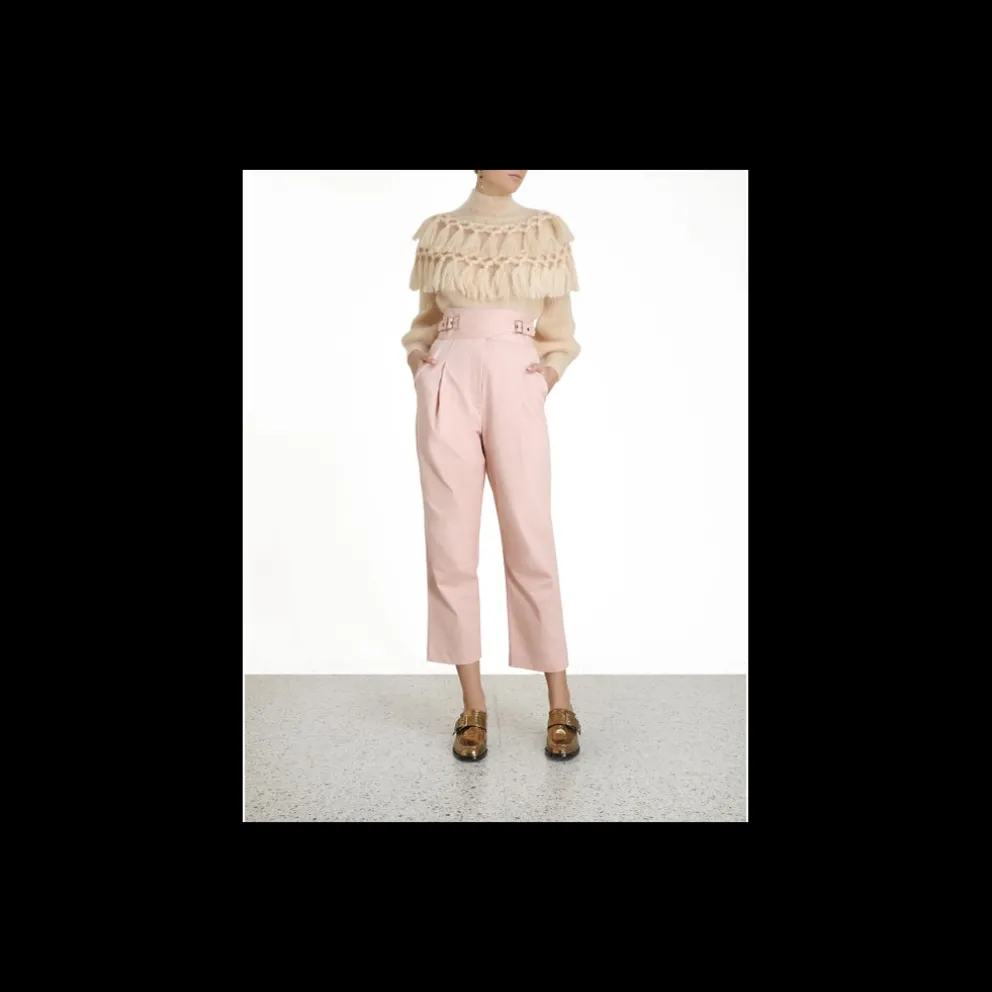 Calça de algodão de cintura alta com cós grosso envolvente com cinto duplo, fivela e fecho de correr.