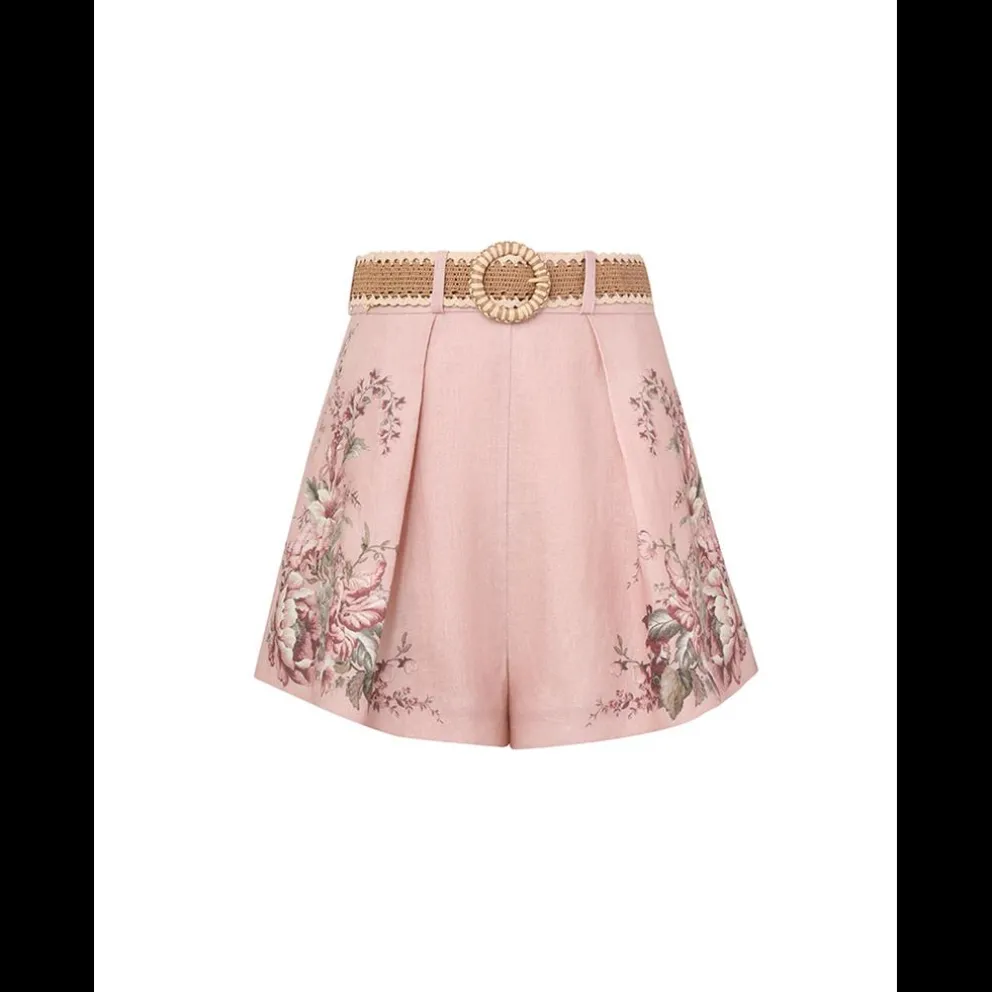 O calção Waverly Tuck em floral rosa. Calções de linho com cintura subida, bolsos nas costuras laterais e cinto com acabamento em ráfia.