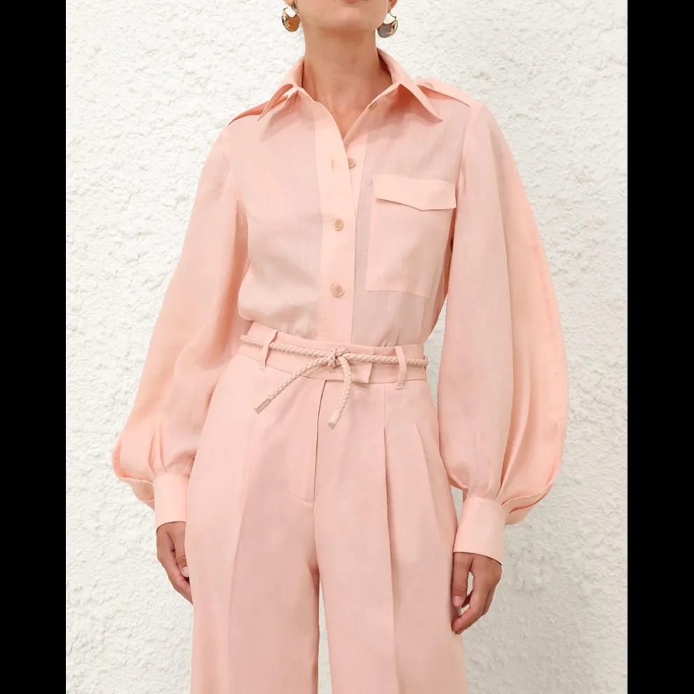 the Illuminate Shirt in Pink from our Spring 2025 Collection, Illumination. A long sleeve blouse featuring a utility silhouette, chest pocket and a classic collar, finished with buttoned up centre front.